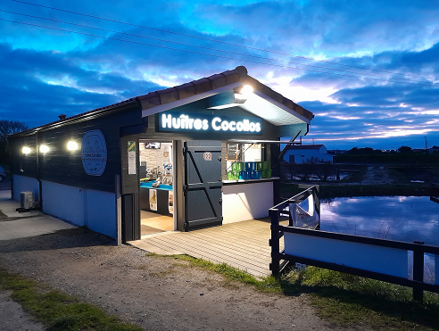 La Boutique « Huîtres Cocollos » entourée de ses claires a le plaisir de vous exposer ses gammes d’huîtres : Spéciales Irlandaises, Fines de Claires, Plates et autres produits selon les saisons comme les Gambas, palourdes, moules, bulots.